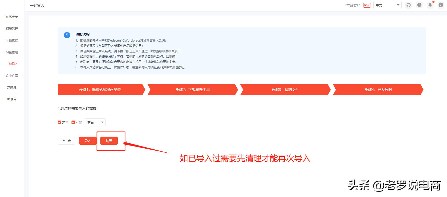 1.6 如果之前已导入过,需要点清理才能再次导入,初次使用不需要操作