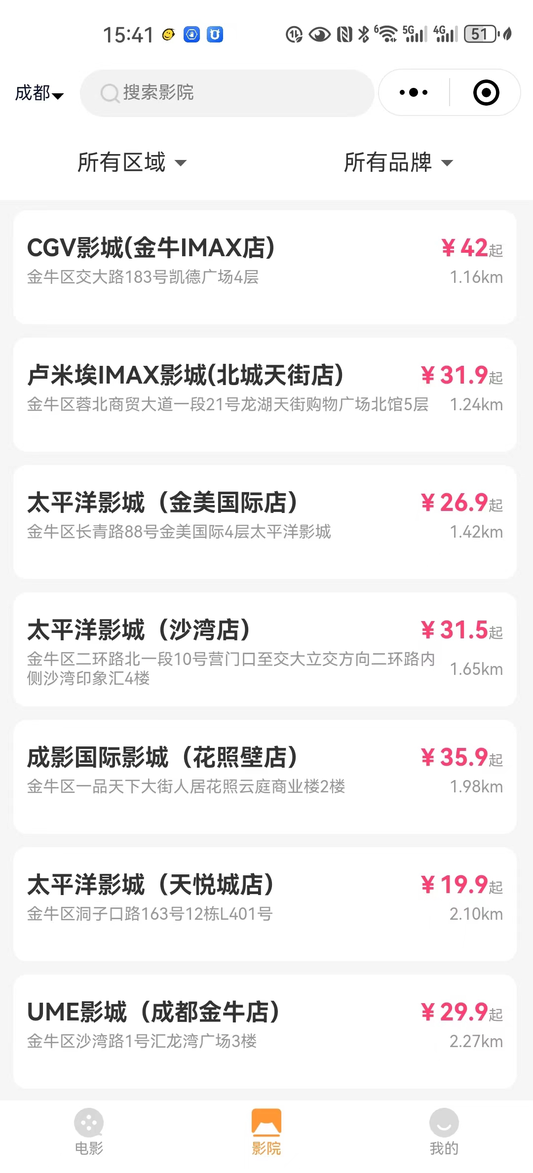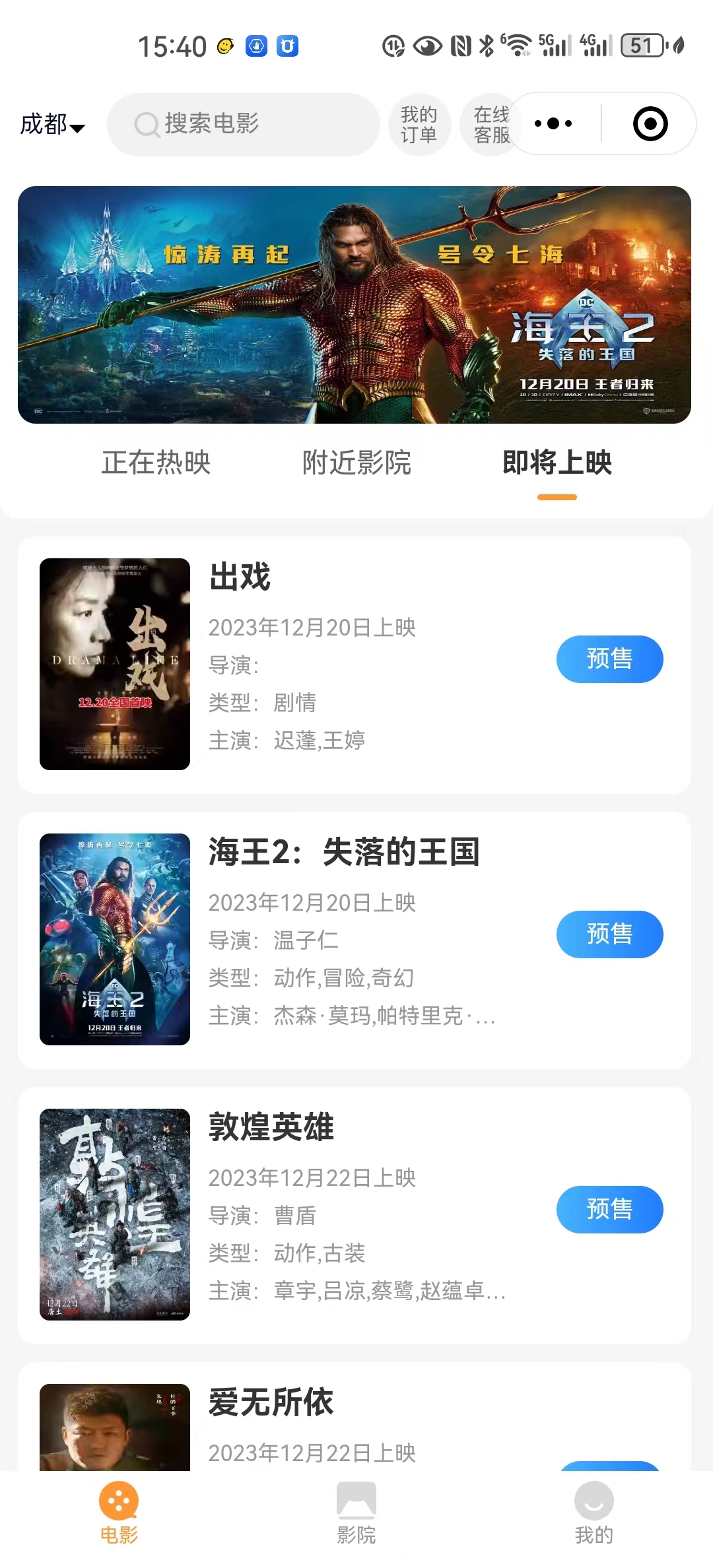 自动定位所在地,推荐附近的影院进行购票。可以选位,查看可选、已售、情侣座等。包括正在热映和即将上映的也会有显示。